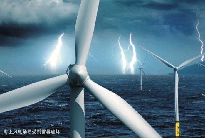 近海地區強對流天氣多發、空氣濕潤,容易形成雷暴。海上風力機矗立在平坦的海面上,同時水氣和鹽霧又會在葉片表面聚集,使得風力機易于遭到雷電襲擊。最可能被雷擊損害的部件是位于風力機最高點的葉片;風力機內部控制系統被雷電流干擾,會導致風力機不能動作或做出錯誤動作;雷電流還會在機艙內部金屬間隙產生火花,引起火災和爆炸。