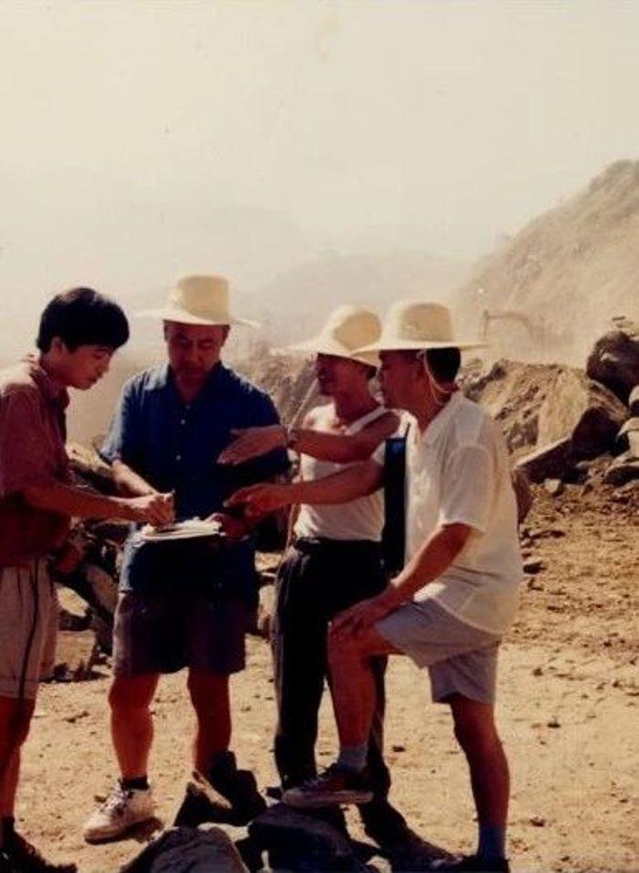 1994年,導流明渠右邊坡設計,鄭守仁(左二)與地質(zhì)人員在現(xiàn)場研究危巖體處理