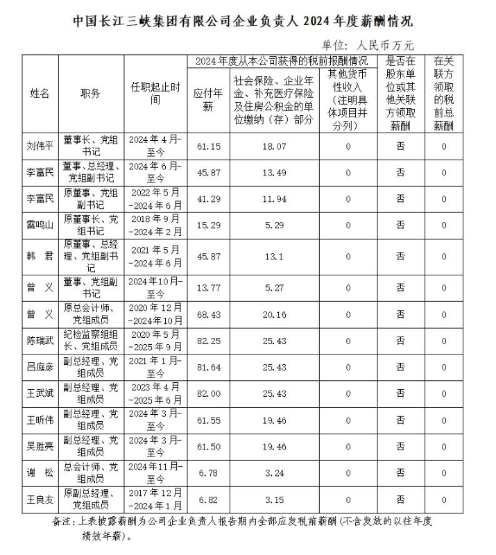 中國長江三峽集團有限公司企業(yè)負(fù)責(zé)人2024年度薪酬情況