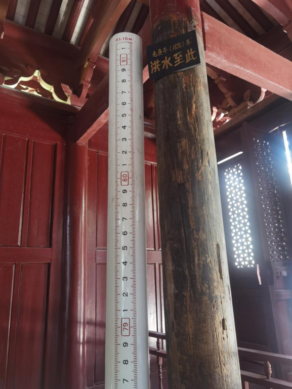 1985年黃陵廟啟動修繕工作,水利部長江水利委員會復核后認定立柱上保留的洪水痕跡與1870年最高水位水平一致,便留下黃陵廟禹王殿內東北角兩根立柱不刷油漆,作為重要水文文物標志予以保存。今天,當我們走進禹王殿時,還能看到一百五十多年前的洪水痕跡,下面一塊木牌上寫著“老庚午(1870)年洪水至此”。