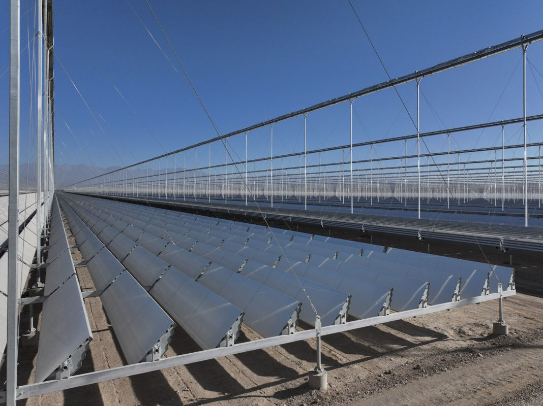 該項目最值得一提的,是其采用的“線性菲涅爾”技術(shù)。“線性菲涅爾”技術(shù)是太陽能光熱發(fā)電技術(shù)的一種,因其采用了法國物理學家菲涅爾所提出的光的反射和折射原理而得名。該技術(shù)使用多排安裝在地面上的、平面或微曲的反射鏡,通過單軸追蹤太陽,將陽光精確地反射到位于高處的固定集熱管上,進而再將熱能轉(zhuǎn)化為電能。相比起傳統(tǒng)的“塔式菲涅爾”,“線性菲涅爾”對場地要求低,其分布式控制也有效提升了發(fā)電的可靠性,降低了運維成本。